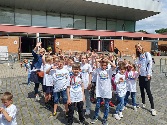 Aber auch auf den Rängen war die Stimmung unter allen Düshorner Kindern großartig, als sie mit über tausend anderen Schulkindern aus unterschiedlichen Regionen unter der Leitung eines Moderators zeigen konnten, was sie gelernt hatten. Dabei wurden sie von einer professionellen Band mit entsprechender Licht- und Tontechnik begleitet, was für ganz unterschiedliche Stimmungen sorgte und teilweise Gänsehautmomente bereitete.